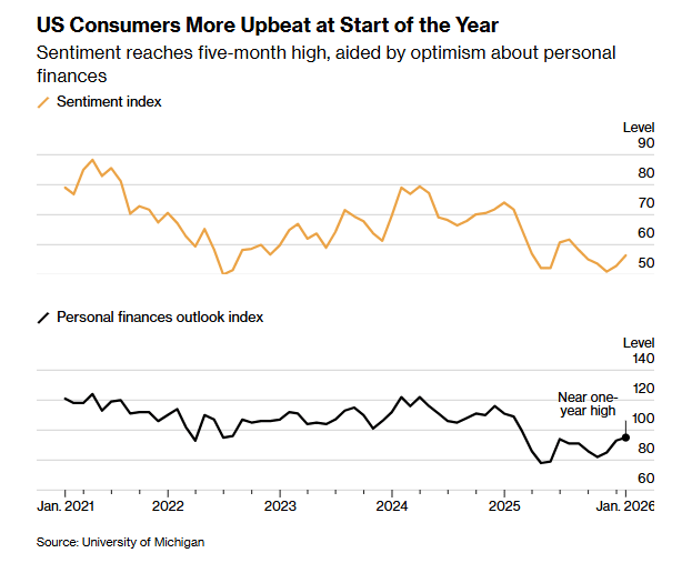 Le sentiment des consommateurs américains a continué de s'améliorer en janvier, le dernier sondage de l'Université du Michigan montrant une révision à la hausse significative. L'indice de sentiment général a été porté à 56,4 contre un initial de 54,0, en hausse par rapport à 52,9 en décembre, marquant la deuxième augmentation mensuelle consécutive et le plus grand bond depuis juin. L'amélioration suggère que les ménages récupèrent progressivement leur confiance malgré des taux élevés et des préoccupations persistantes concernant l'inflation.