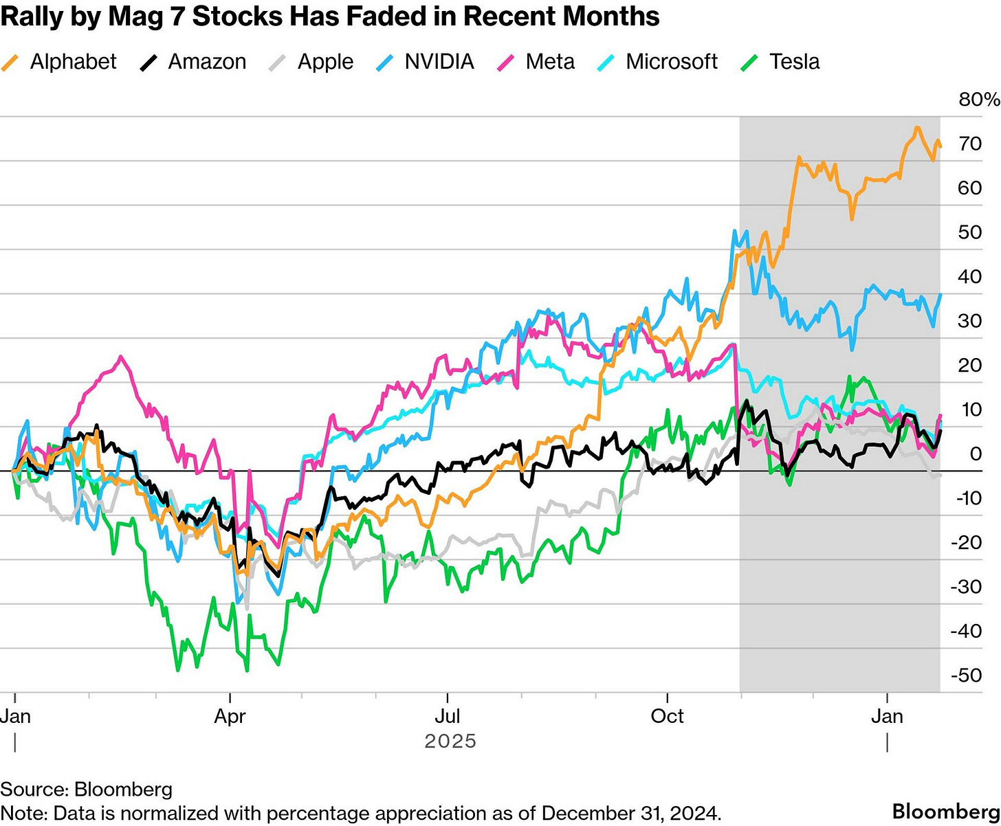 Cette dynamique de concentration n'est pas limitée à la crypto. Dans les actions, la domination de longue date de la technologie à méga-cap commence à se fissurer. Les soi-disant Magnificent 7 n'ont augmenté que de 0,5 % depuis le début de l'année, sous-performant matériellement le gain de 1,8 % du S&P 500 dans son ensemble, marquant la première période depuis 2022 où la plupart du groupe a sous-performé l'indice. Les investisseurs remettent de plus en plus en question des valorisations tendues, en particulier alors que d'anciens leaders tels que Meta et Apple ont glissé dans un territoire négatif pour l'année, signalant une fatigue dans ce qui a été le commerce le plus encombré du marché.