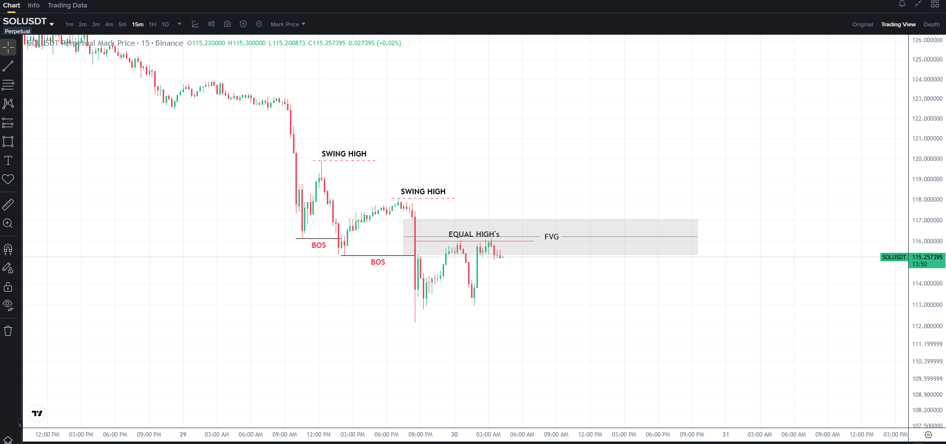 Comme nous pouvons le voir sur le graphique que sur le cadre temporel Journalier, SOLANA est toujours baissier. Peut-être qu'il peut y avoir un petit retracement / pull back. Mais finalement, le prix de SOLANA doit tomber pour prendre de la liquidité. Nous savons tous que le prix suit la liquidité. J'étais baissier sur SOLANA depuis le 30 septembre 2025 et il est toujours baissier jusqu'à aujourd'hui. Donc, sans saisir cette forte liquidité là-bas, je ne vais pas prendre de position longue jusqu'à un mouvement propre et frais.
