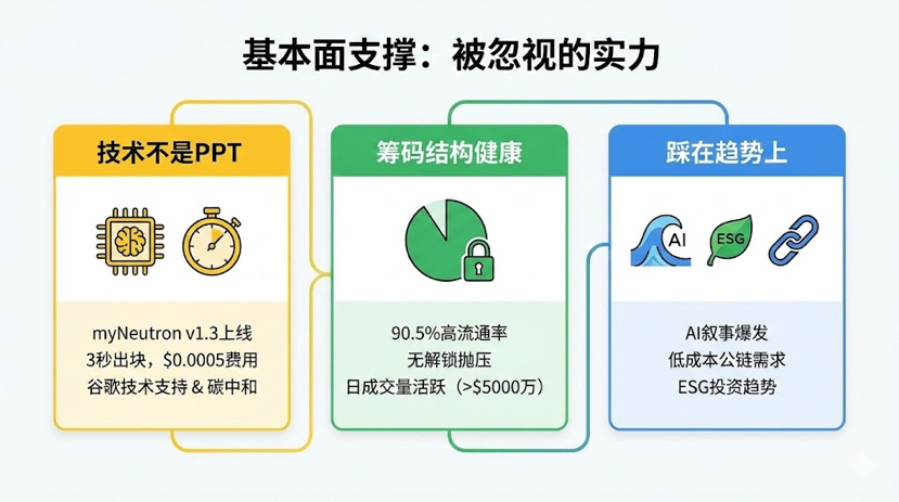 1. La technologie n'est pas un PPT : Son produit AI central myNeutron v1.3 est déjà en ligne, ce n'est pas un concept. En termes de performance, 3 secondes pour produire un bloc + 0,0005 dollars de frais, c'est des milliers de fois moins cher et plus rapide qu'Ethereum. De plus, il bénéficie du soutien technologique de Google pour atteindre la neutralité carbone.