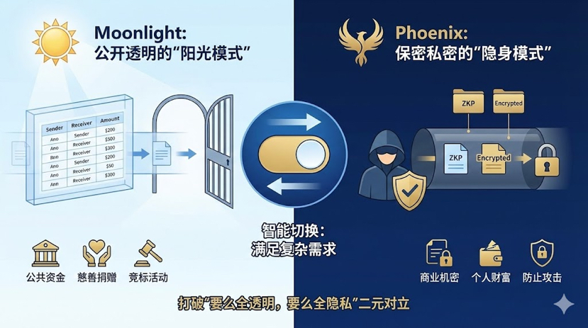 Moonlight : le "mode soleil" ouvert et transparent. Le mode Moonlight maintient la valeur fondamentale de la blockchain traditionnelle - la transparence totale. Toutes les informations de transaction sont publiques sur la chaîne, et tout le monde peut les vérifier. Ce mode convient aux scénarios nécessitant une transparence totale : utilisation de fonds publics, dons caritatifs, activités d'enchères, etc. Les utilisateurs peuvent voir clairement le flux des fonds, comme s'ils consultaient un relevé bancaire. Pour les institutions devant accepter un contrôle public, cette transparence est essentielle.