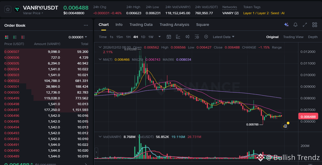 As of early February 2026, the price action for $VANRY shows a classic "Accumulation Phase" on the 1D chart.
