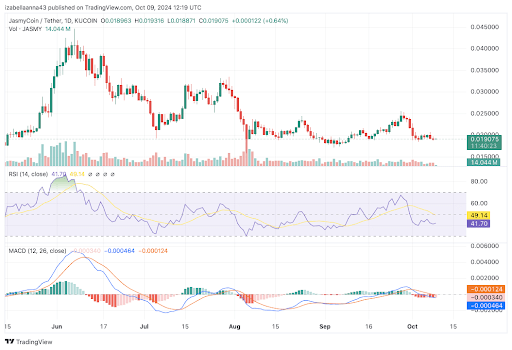 Nilai RSI sebesar 42,42 menunjukkan bahwa JasmyCoin mendekati wilayah jenuh jual, yang berpotensi bersiap untuk pembalikan. Namun, indikator MACD menunjukkan momentum bearish karena diperdagangkan di bawah garis sinyal.