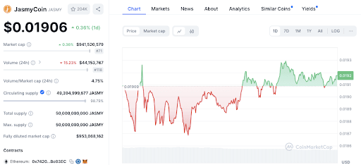 JasmyCoin saat ini diperdagangkan pada harga $0,01914, dengan pergerakan harga terkini menunjukkan periode konsolidasi. Dalam 24 jam terakhir, harga telah berfluktuasi antara harga terendah $0,01907 dan harga tertinggi $0,0193. Setelah kenaikan singkat, harga menjadi stabil, mencerminkan pendekatan pasar yang hati-hati.
