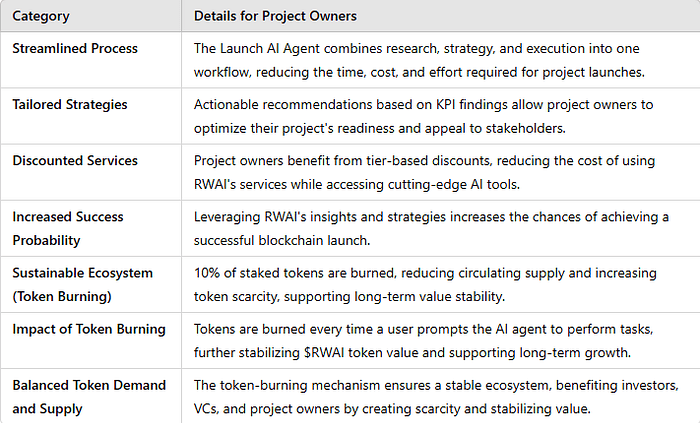 Pemilik proyek dapat mengakses Agen AI Peluncuran dengan melakukan staking 50.000.000 $RWAI atau $RWA selama minimal 60 hari. Fase ini mengotomatiskan langkah-langkah kompleks yang terlibat dalam meluncurkan proyek Web3 atau RWAs yang ter-tokenisasi.