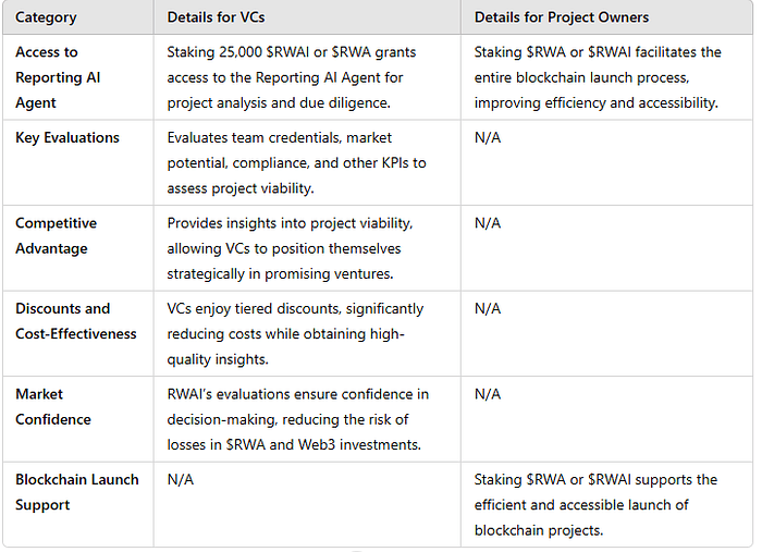 Dengan melakukan staking 25.000 $RWAI atau $RWA, VC memperoleh akses ke Agen AI Pelaporan, yang menawarkan analisis proyek secara mendalam dan laporan uji tuntas. Ini mencakup evaluasi kredensial tim, potensi pasar, kepatuhan, dan KPI kritis lainnya.