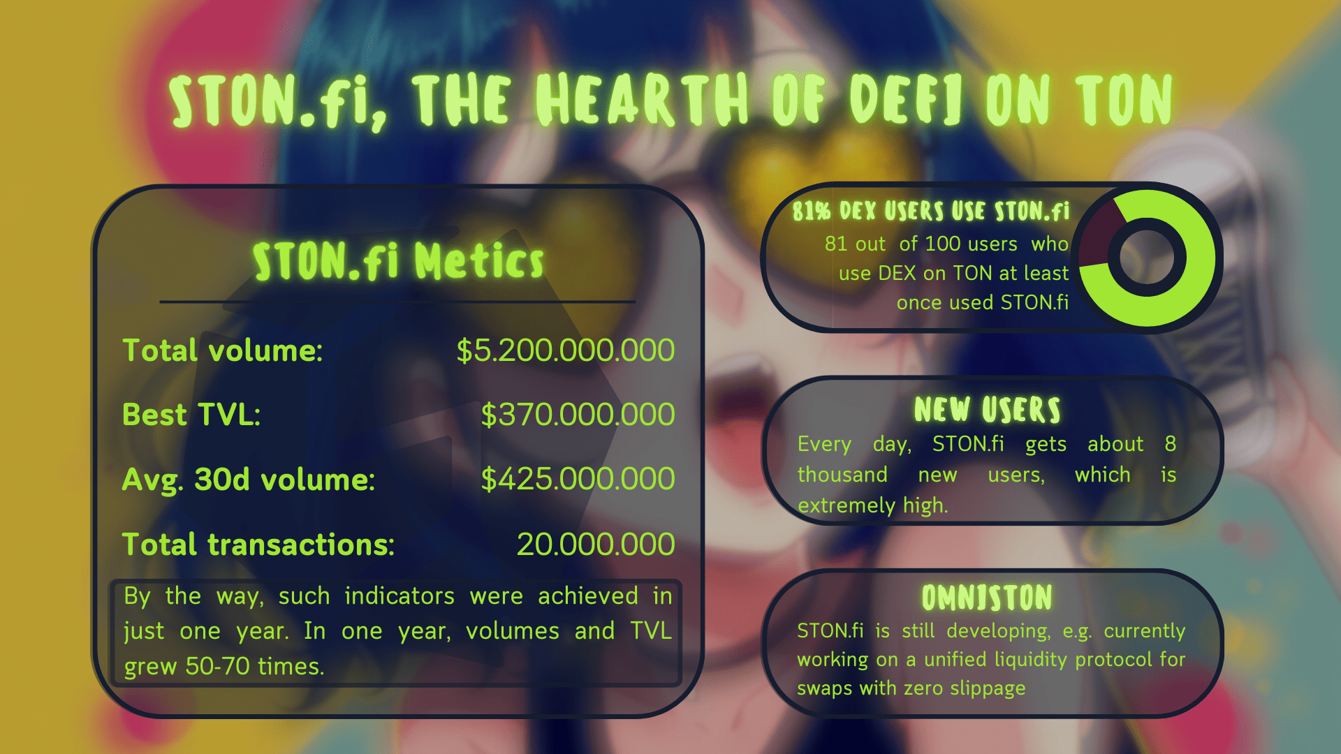 Berkat sistem ini, antarmuka yang sederhana namun indah dan ramah pengguna, pengembangan yang keren, dan hal-hal lainnya, STON.fi telah mencapai hasil yang sangat baik, seperti yang ditunjukkan pada infografik:
