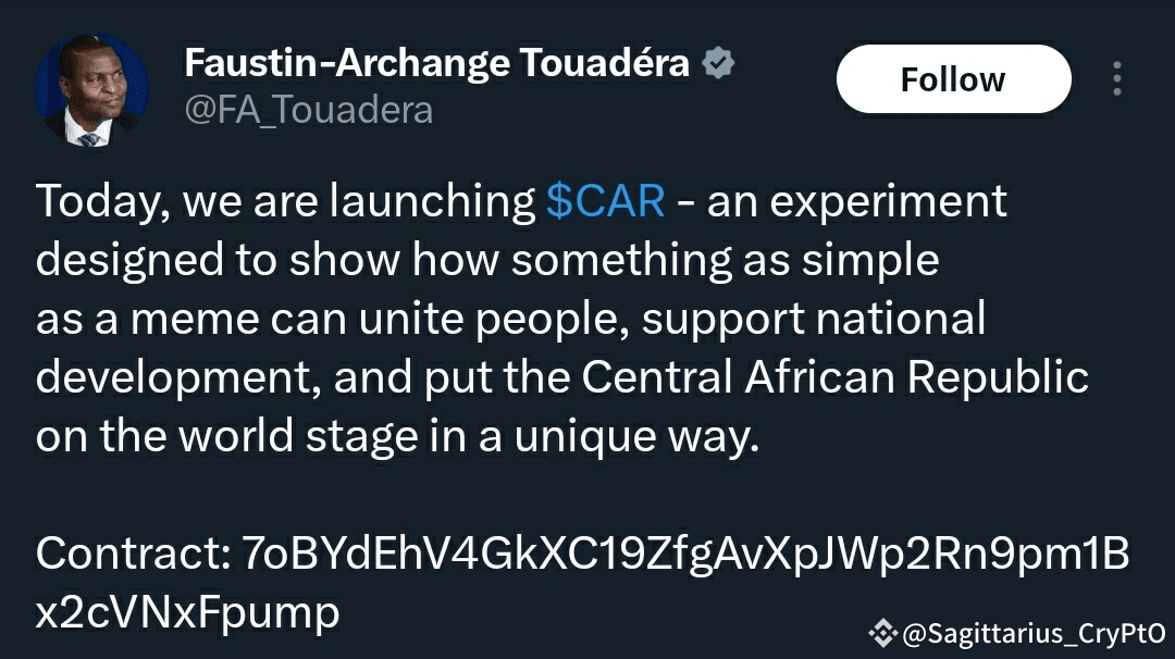Akun X resmi Presiden Republik Afrika Tengah 🇨🇫 mengumumkan bahwa negara tersebut telah meluncurkan memecoin 🪙 sebagai bagian dari eksperimen untuk melihat apakah itu dapat menguntungkan pembangunan nasional 📈.