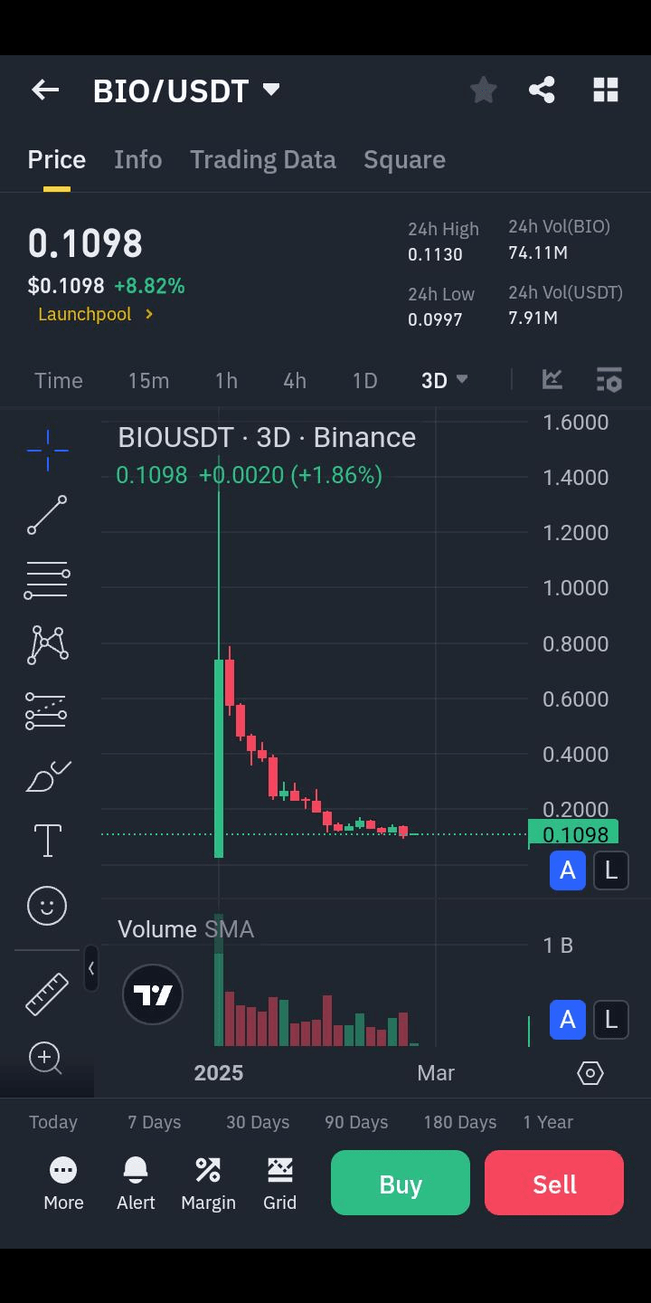 Melihat grafik, kita bisa melihat bahwa *BIO* telah mengalami penurunan harga yang tajam. Harga saat ini adalah *0.1098*, yang merupakan *+8.82%* dari hari sebelumnya. Meskipun menunjukkan beberapa kenaikan hari ini, kita masih jauh dari puncak yang pernah dicapai. Harga telah berfluktuasi antara *tinggi 24 jam 0.1130* dan *rendah 24 jam 0.0997*. Penting untuk dicatat bahwa *BIO* telah berjuang untuk keluar dari tren penurunan yang telah berlangsung cukup lama.