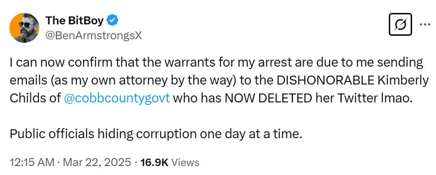 Pada 21 Maret, Armstrong memposting di X bahwa ia dapat "mengonfirmasi ada surat perintah penangkapan" terhadap dirinya — diduga karena email yang ia kirim kepada Hakim Pengadilan Tinggi Georgia, Kimberly Childs, saat bertindak sebagai pengacaranya sendiri.