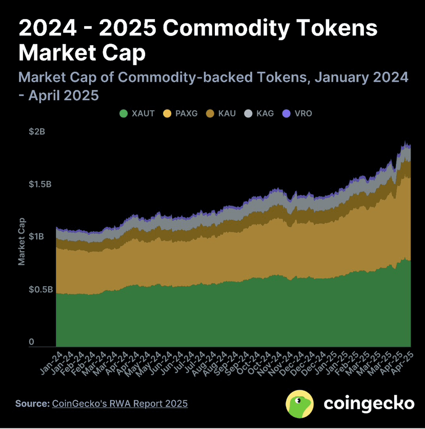 Token berbasis komoditas tumbuh sebesar +67,8% antara 2024 - 2025, menambah +$773,9 juta ke kapitalisasi pasarnya. Lonjakan ini membuatnya mencapai titik tertinggi sepanjang masa sebesar $1,9 miliar di tengah prospek ekonomi global yang tidak pasti.