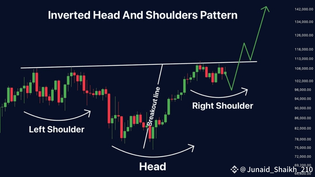 $BTC sedang mengikuti pola bullish klasik โ kepala dan bahu terbalik.