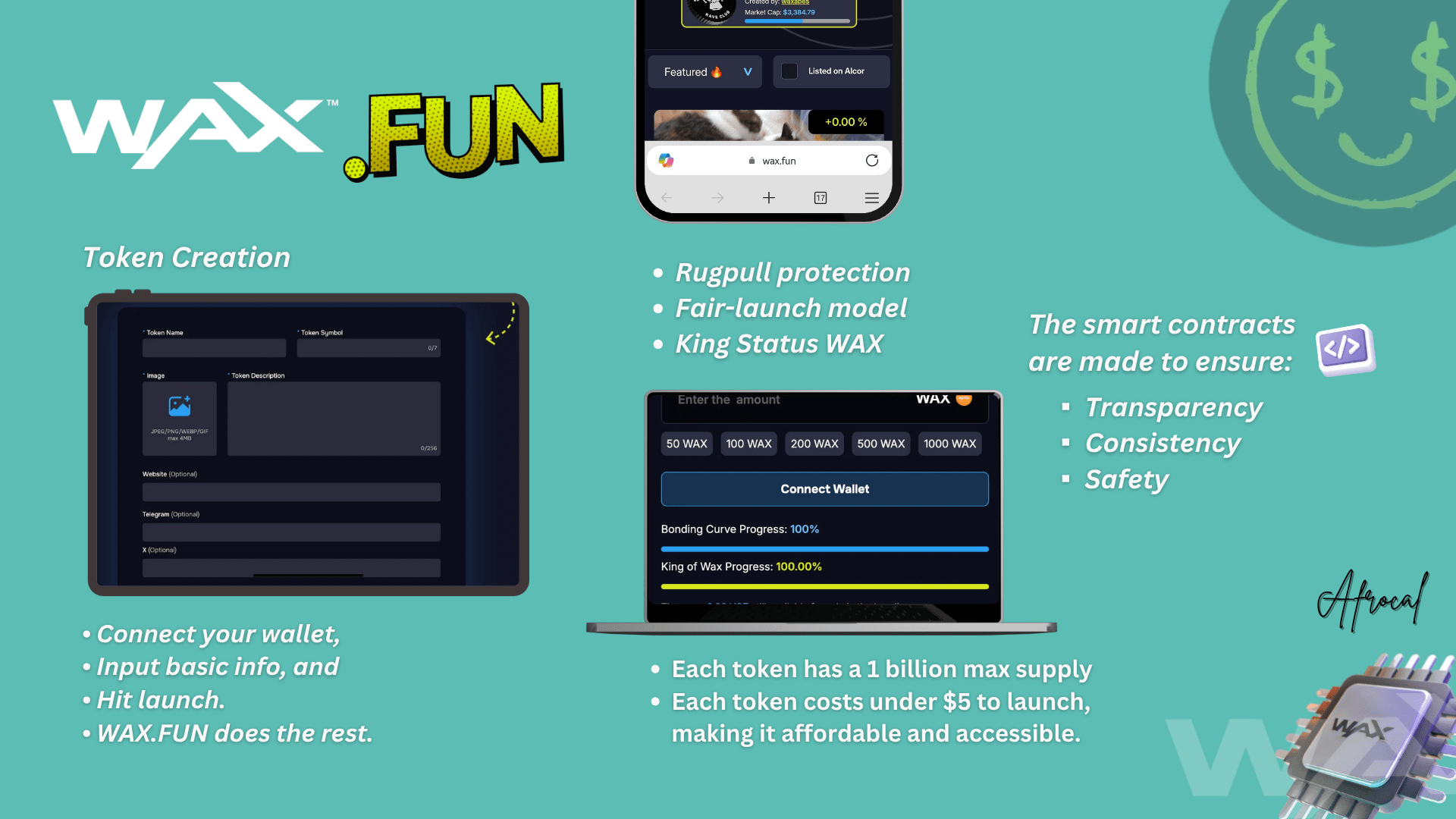 Wax.fun memungkinkan pengguna untuk membuat token tanpa pra-penjualan, alokasi tim, atau keuntungan belakang. Setiap token mengikuti struktur inti yang sama hanya nama, gambar, dan metadata opsional (seperti tautan sosial) yang bervariasi.