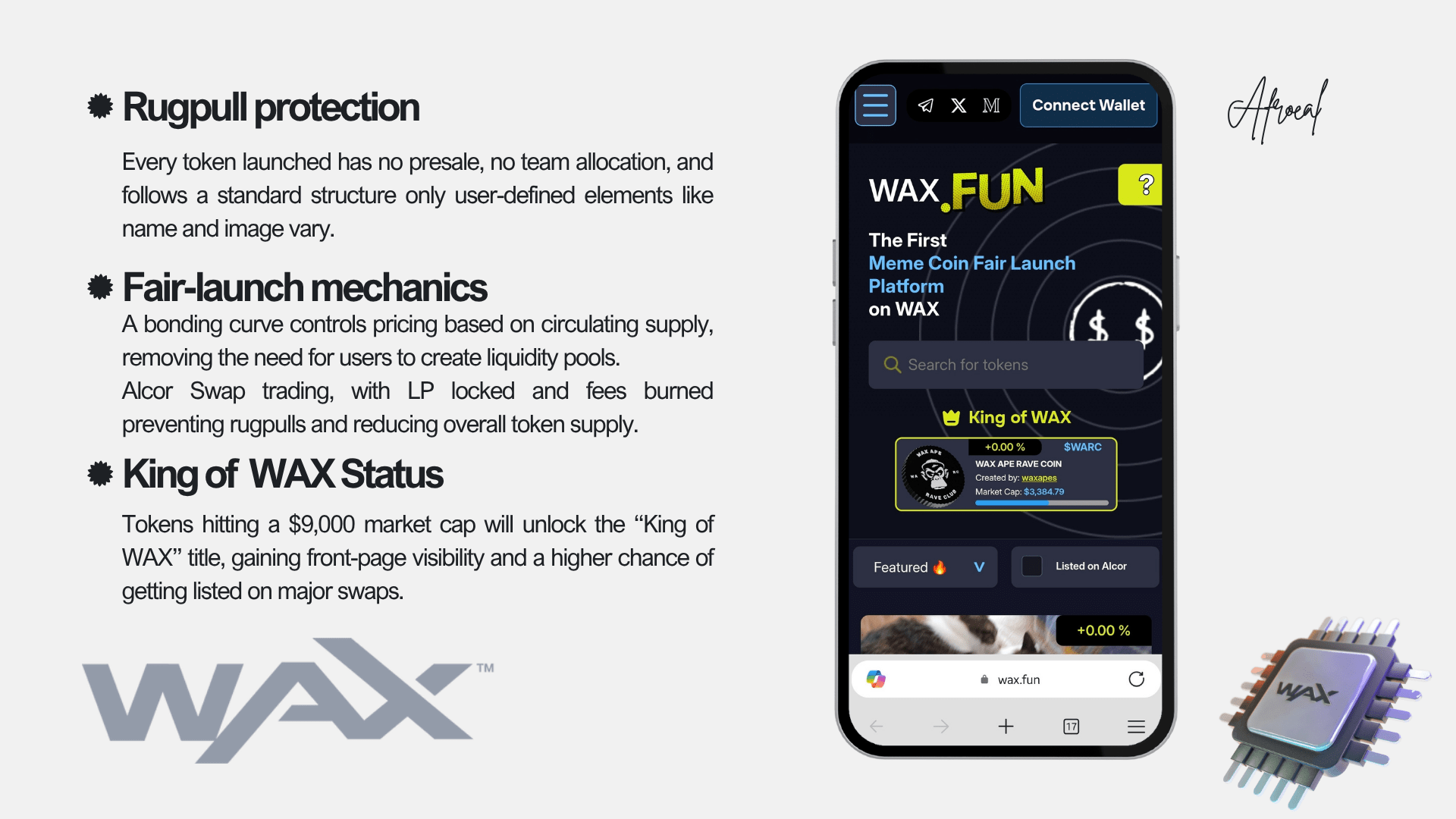 Di jantung platform ini adalah kurva bonding, yang mengatur bagaimana harga token meningkat seiring dengan pasokan. Pengguna dapat membeli token secara langsung tanpa perlu membuat kolam likuiditas secara manual. Setelah cukup token dibeli (sekitar 80% dari pasokan), token secara otomatis dapat diperdagangkan di Alcor Swap, dan kolam likuiditas terkunci tanpa kemungkinan penarikan, sepenuhnya aman dari rugpull.
