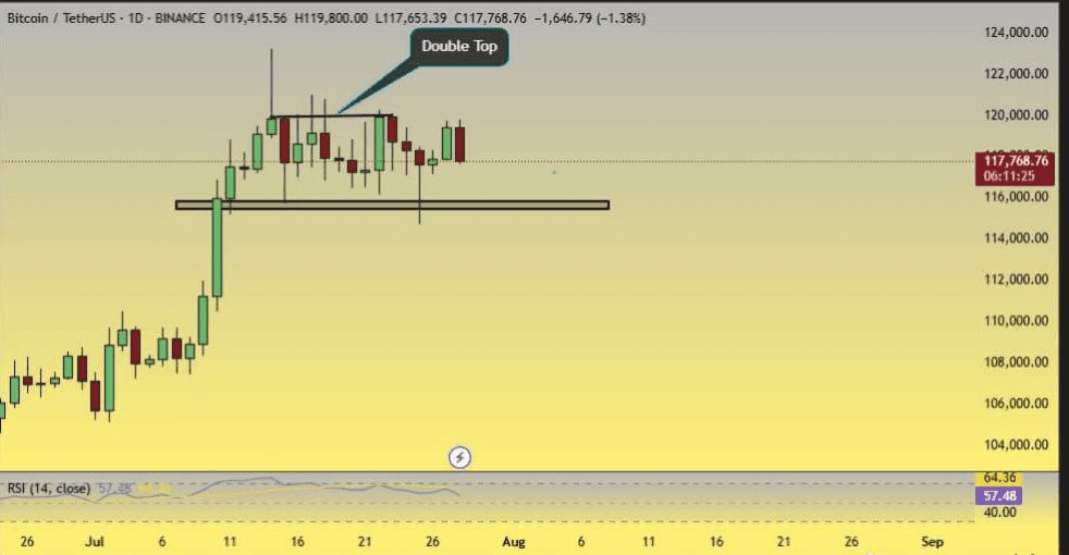 ⚠️ Potensi double top sedang berkembang di dekat 120.000—sebuah tanda kemungkinan resistensi. Jika BTC gagal menembus level ini, kita mungkin melihat penarikan jangka pendek menuju dukungan yang lebih rendah.