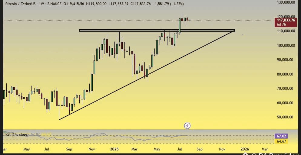 Gambaran yang lebih besar tetap bullish, tetapi candle mingguan saat ini menunjukkan tanda-tanda tekanan jual. Dukungan kunci di 110.000 tetap kritis—jika level itu pecah, koreksi yang lebih dalam bisa terjadi. Selama BTC diperdagangkan di atas garis ini, tren naik yang lebih luas tetap valid.
