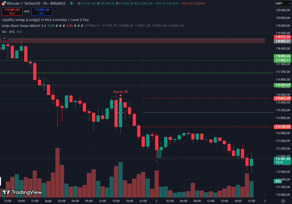 Harga ditolak dua kali dari OB Bearish di ~115.8K.