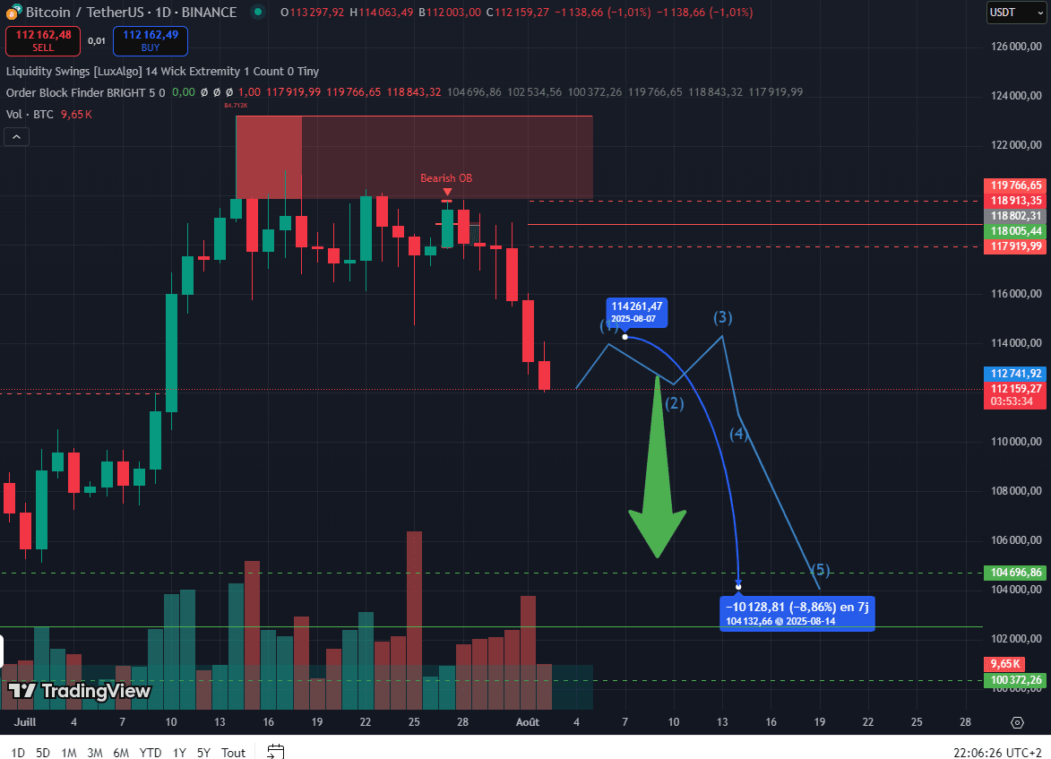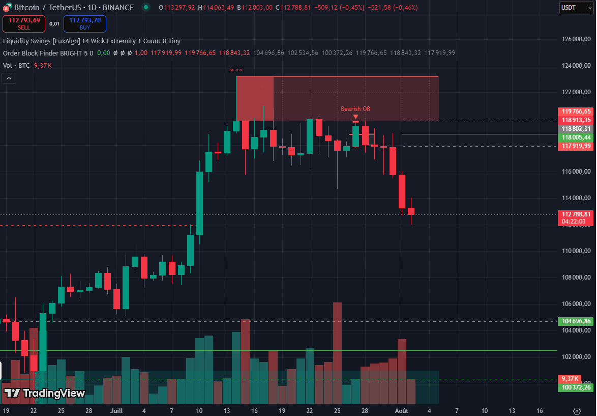 OB bearish yang kuat terbentuk di area [118K–124K].