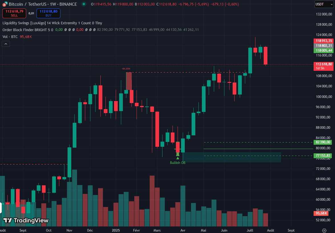 OB bullish jelas berada di kisaran [77K–84K], yang merupakan area permintaan terpenting pada kerangka waktu panjang.