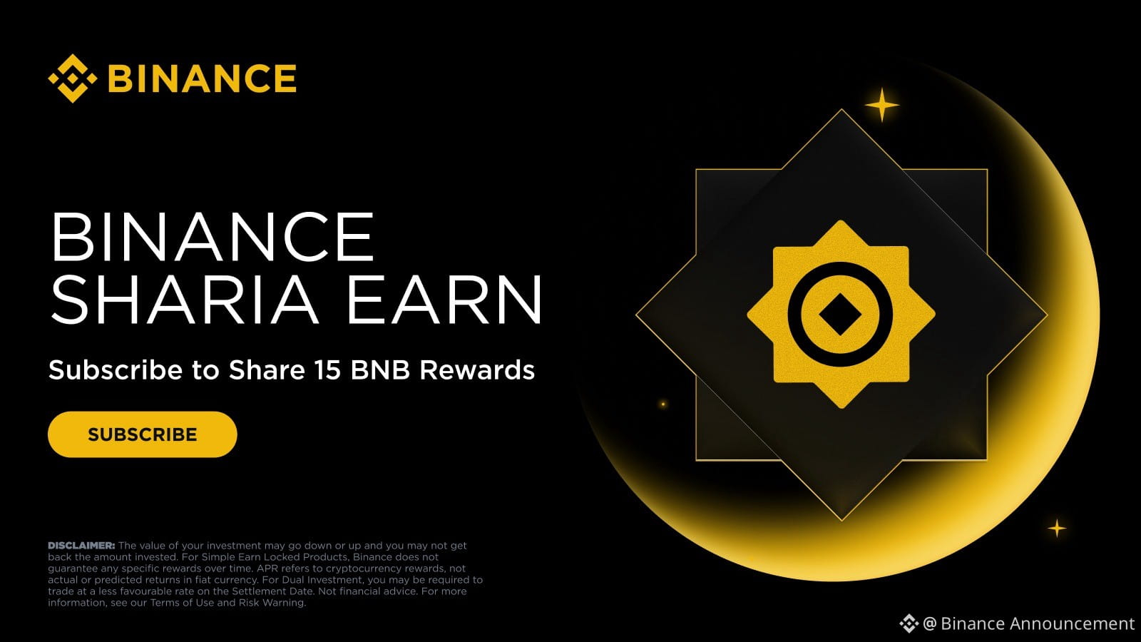 Dalam waktu terbatas selama Ramadan, pengguna yang memenuhi syarat dapat melanggan BNB ke Produk Terkunci Sharia Earn untuk berkesempatan berbagi 15 BNB secara merata. Pengguna dapat memperoleh penghasilan dengan cara yang selaras dengan tujuan finansial dan nilai-nilai mereka.