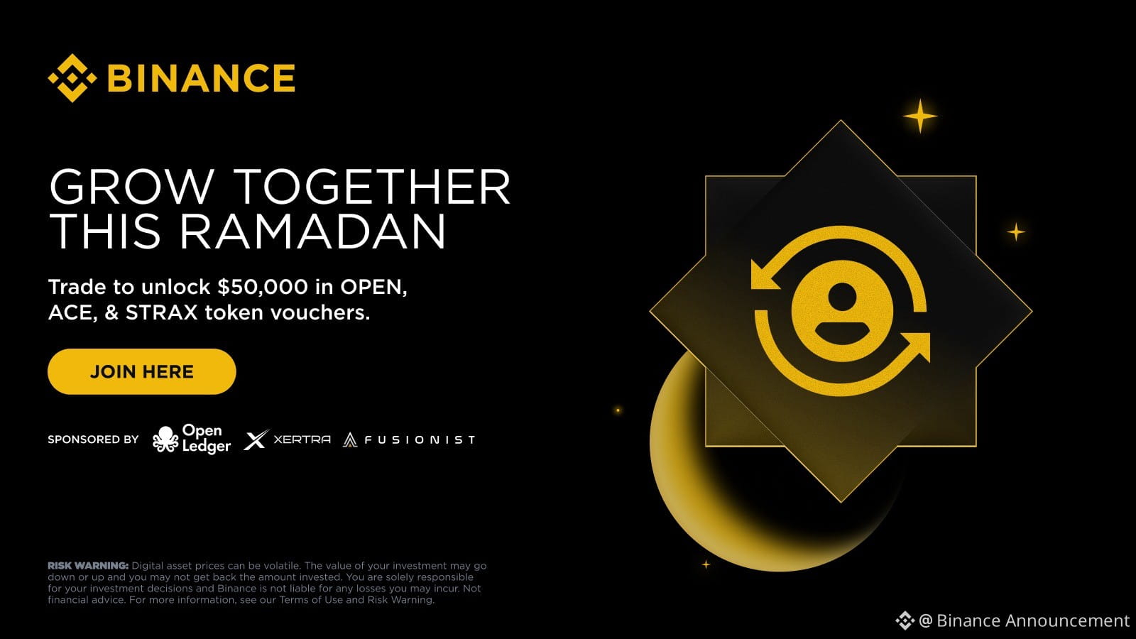 Memperkenalkan Binance Ramadan Grow Together 2026, kampanye trading Spot kolektif di mana seluruh komunitas bekerja sama untuk membuka pool reward $50.000 yang didistribusikan dalam OPEN, ACE, & STRAX.