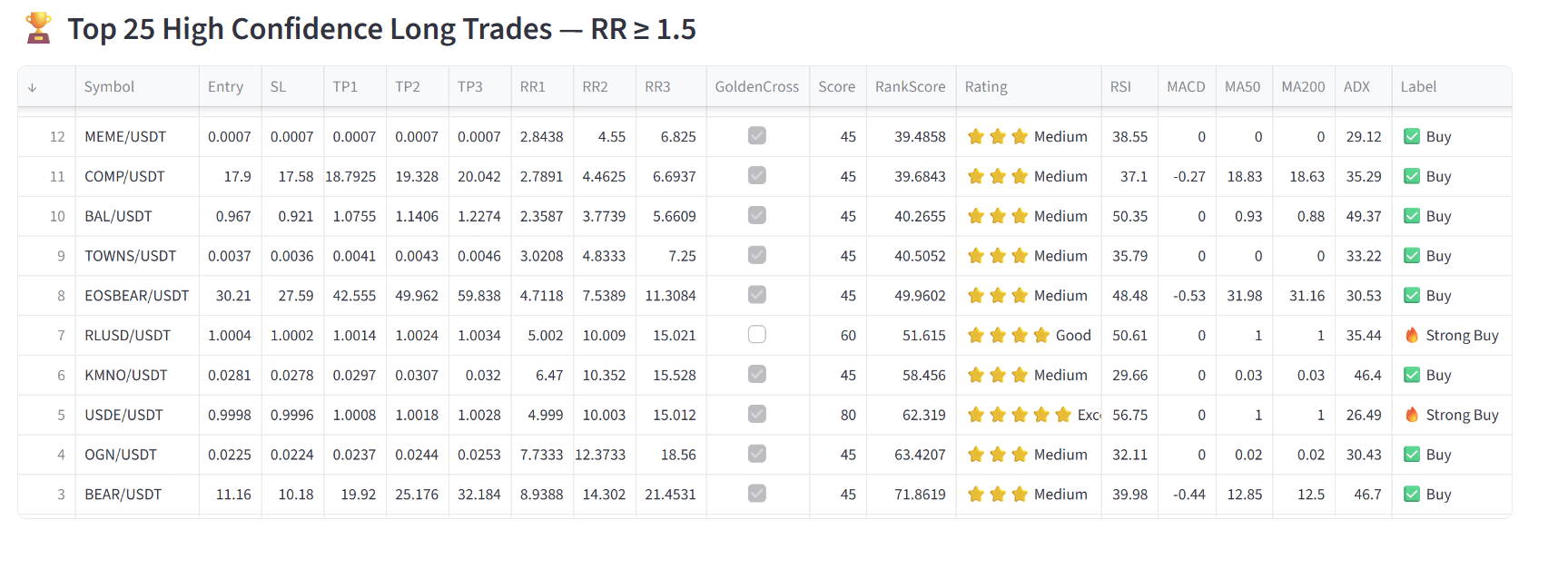 • $MEME – Currently showing a Golden Cross entry at 0.0007. While the score sits at a neutral 45, the structural setup suggests a tightening range that typically precedes a volatility expansion.