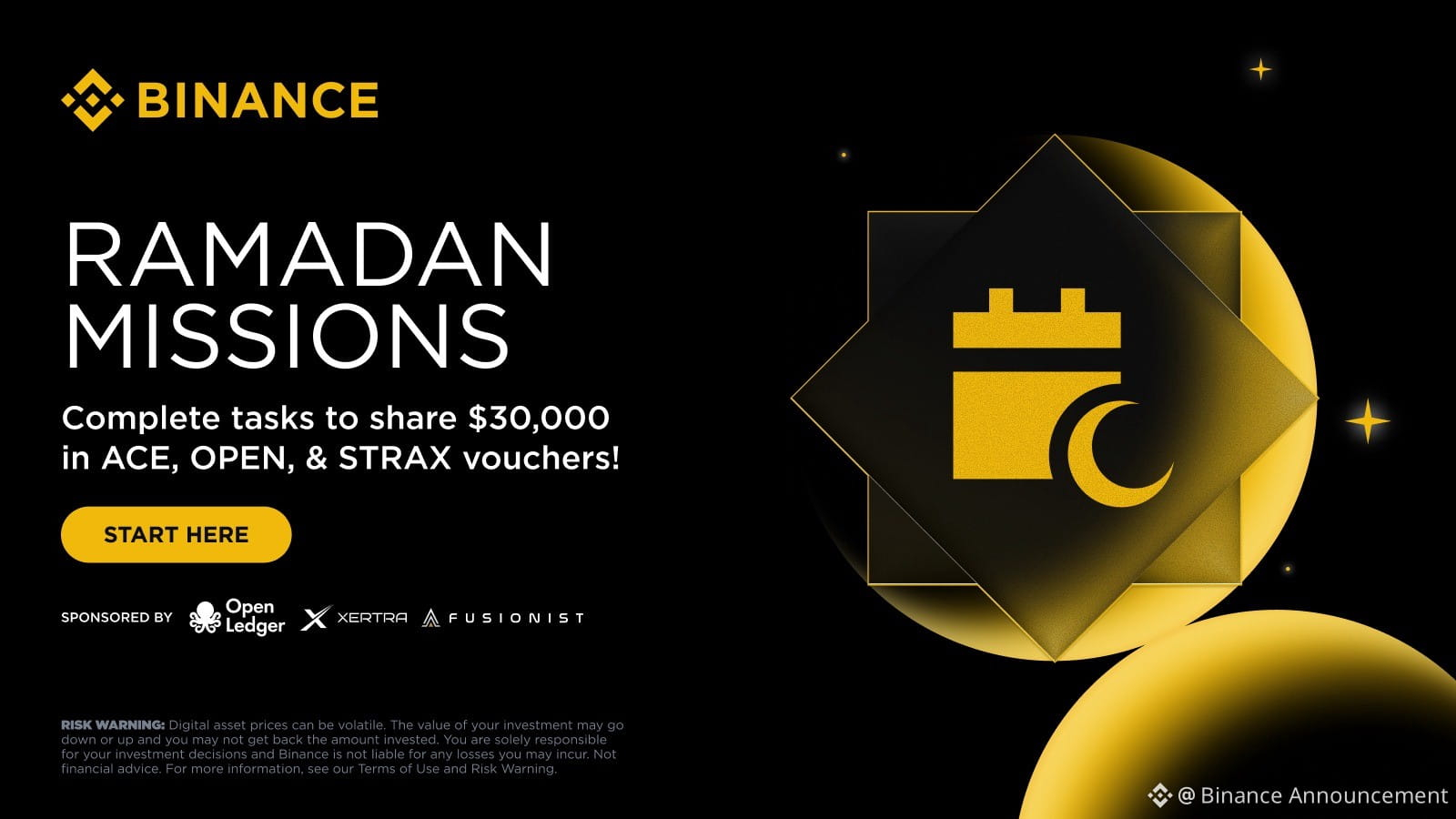 Pada Ramadan ini, Binance mengundang Anda untuk berpartisipasi dalam Misi Ramadan 2026, di mana pengguna yang memenuhi syarat dapat menyelesaikan tugas perdagangan dan referral harian untuk memperoleh poin dan membuka bagian dari token voucher OPEN, ACE, dan STRAX senilai $30.000.