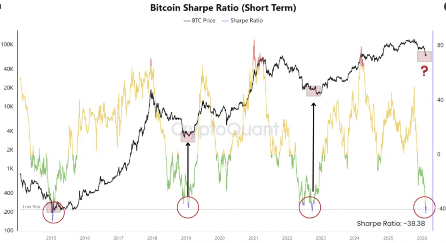 Koefisien Sharpe jangka pendek untuk $BTC turun ke level yang secara historis mendahului titik terendah harga. Hal ini diperhatikan oleh analis CryptoQuant Ignacio Moreno de Vicente.