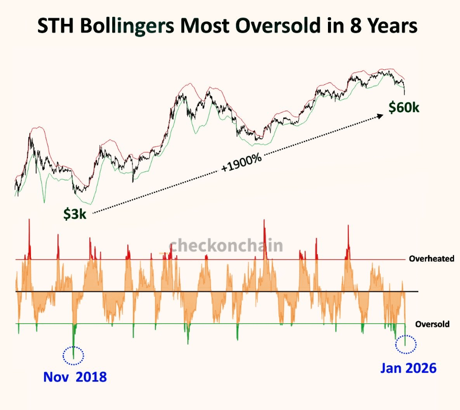 Bollinger Bands untuk STH menunjukkan kondisi penjualan berlebihan yang tercatat dalam delapan tahun. Metrik ini mengukur perbedaan antara harga saat ini dari cryptocurrency dan harga rata-rata pembelian mereka yang memiliki koin kurang dari 155 hari.