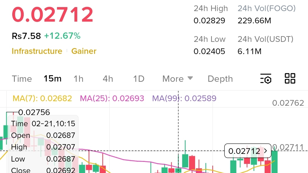 Mengamati grafik $FOGO O hari ini di Binance, kita dapat melihat momentum bullish yang kuat. Token saat ini diperdagangkan pada 0.02711, menunjukkan kenaikan yang luar biasa sebesar +12.63% hanya dalam 24 jam.