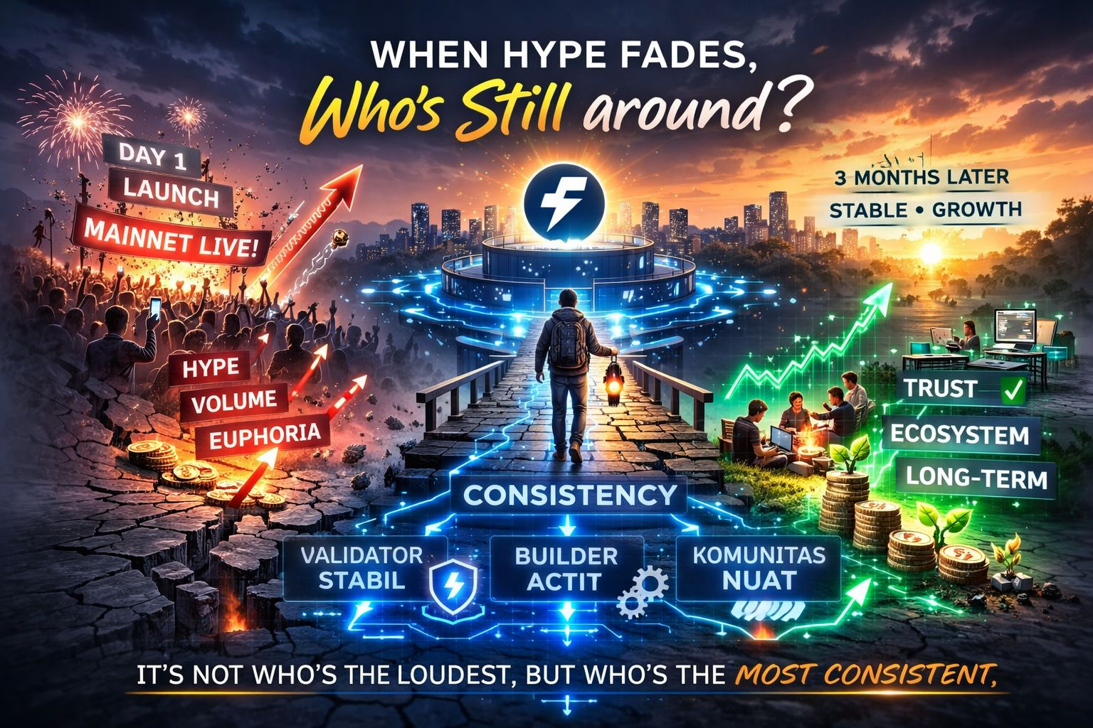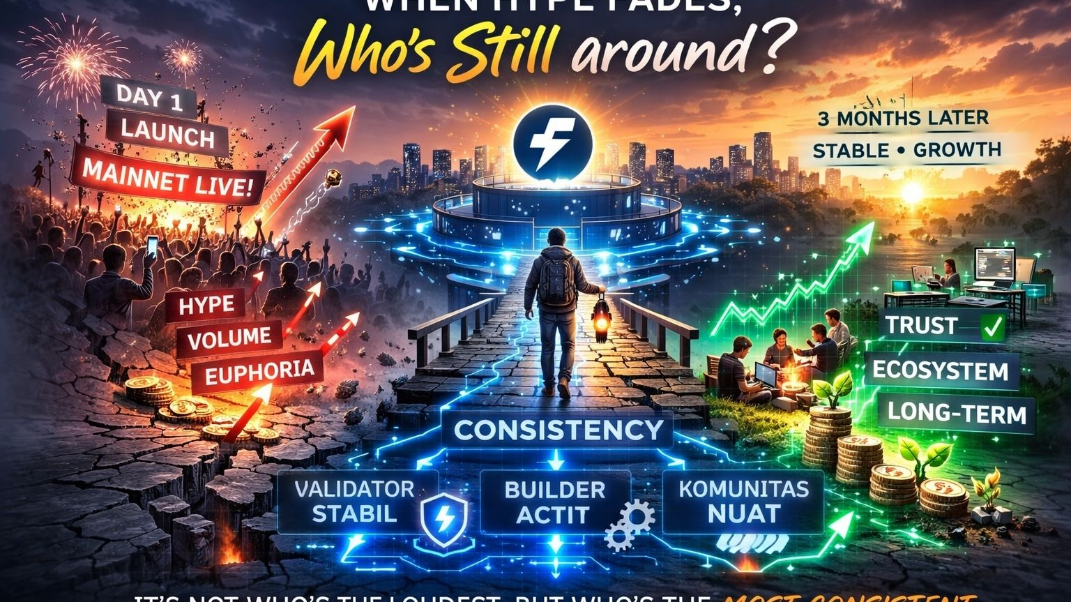 Karena dalam pengalaman saya mengikuti berbagai proyek, yang bertahan bukan yang paling keras saat launch.