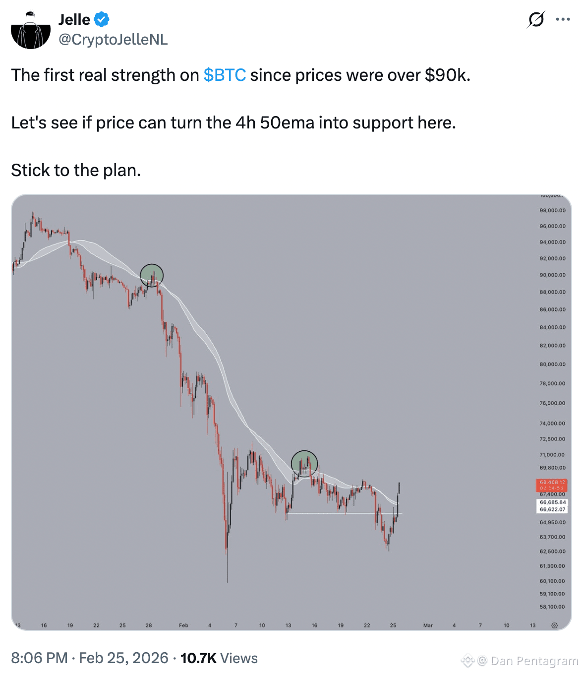 Ampliando la imagen, su compañero analista Jelle afirmó que el precio debe convertir la EMA 50 (en 68.000 dólares) del gráfico de cuatro horas en soporte para confirmar la recuperación.