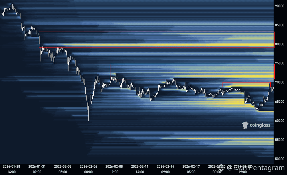 Los últimos datos del recurso de seguimiento CoinGlass muestran que el precio de $BTC está aprovechando la liquidez en torno a los 70.000 dólares, y la mayor parte del interés aún está agrupado por encima del precio al contado.