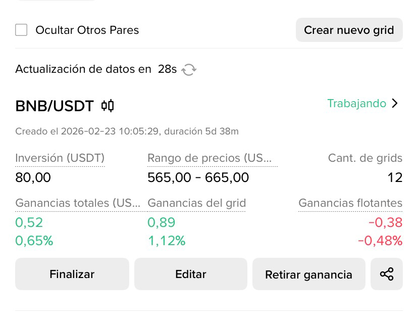 Recientemente activé un Bot de Grid Spot con $80 USDT en el par BNB/USDT y los resultados confirman que la paciencia paga.