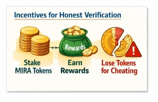 The network’s design doesn’t just rely on technology—it also uses economic incentives to encourage honest work. Node operators (the people or organizations that run the verifier systems) must lock up and stake the native $MIRA token. When they verify claims accurately, they earn rewards. But if they try to cheat or randomly guess answers, part of their staked tokens can be taken away as a penalty. This combination of incentives and penalties helps make sure verifiers are careful and honest.