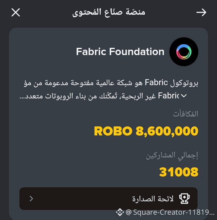 تابع وانشر وتداول لكسب 4,300,000 ROBO من مُكافآت الرموز المميزة من لائحة الصدارة العالمية. للتأهل للائحة الصدارة والمكافأة، يجب عليك إكمال كل نوع من المهام (نشر: اختر 1) مرّة واحدة على الأقل خلال الفعالية للتأهل. ستُعدّ المنشورات التي تتضمن ظروف حمراء أو هدايا غير مؤهلة. سنستبعد من الفعالية المشاركين الذين يثبت انخراطهم في مشاهدات أو تفاعلات مشبوهة، أو يُشتبه في استخدامهم لبوتات آلية. سيؤدي أي تعديل على منشورات منشورة سابقًا ذات تفاعل مرتفع لإعادة توظيفها كعمليات تقديم للمشروع إلى الاستبعاد.