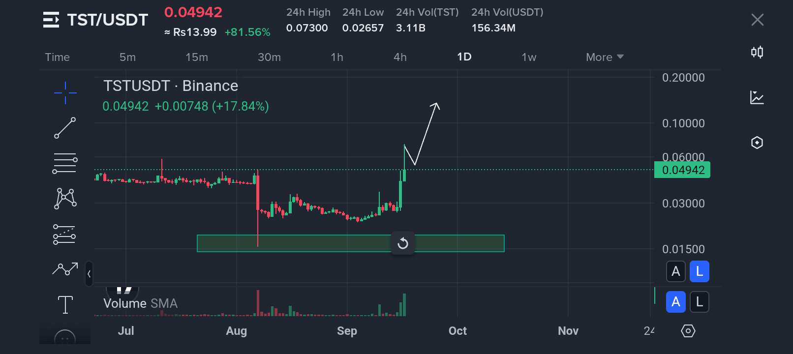 Selama beberapa minggu, TST diperdagangkan di dalam zona konsolidasi yang ketat, membangun tekanan di sekitar kisaran $0.026 – $0.030 (ditandai dengan hijau pada grafik). Zona ini bertindak sebagai level akumulasi yang kuat di mana pembeli dengan tenang membangun posisi.