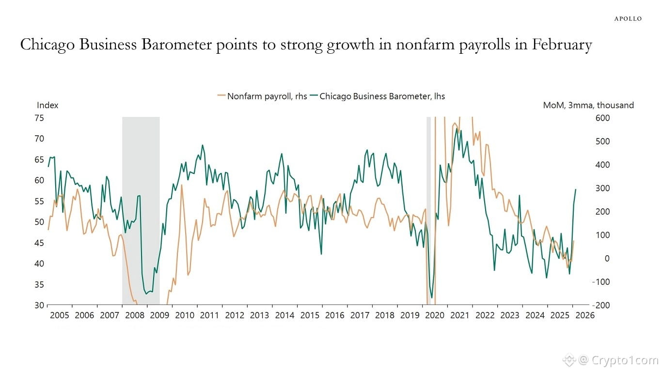 The Chicago Business Barometer for February showed strong improvements across production, employment, new orders and deliveries, see chart below. Perhaps we are underestimating the positive effects of the One Big Beautiful Bill, which took effect on January 1. The CBO estimates that it will boost GDP growth by 0.9% in 2026, and the chart below suggests that nonfarm payrolls in February could be significantly stronger than the 58,000 currently expected by consensus.