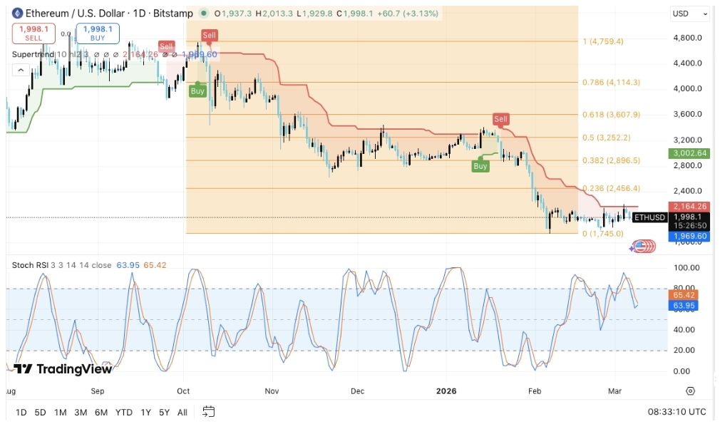 Level kunci untuk Ethereum tetap jelas terdefinisi, karena pasar stabil di sekitar 2 000๐ฒ. Trader terus memantau apakah rebound baru-baru ini dapat berkembang menjadi pemulihan yang lebih kuat. Sejauh ini, tren yang lebih luas masih condong bearish. Namun, pergerakan harga jangka pendek menunjukkan tanda-tanda awal konsolidasi setelah penurunan tajam di bulan Februari.