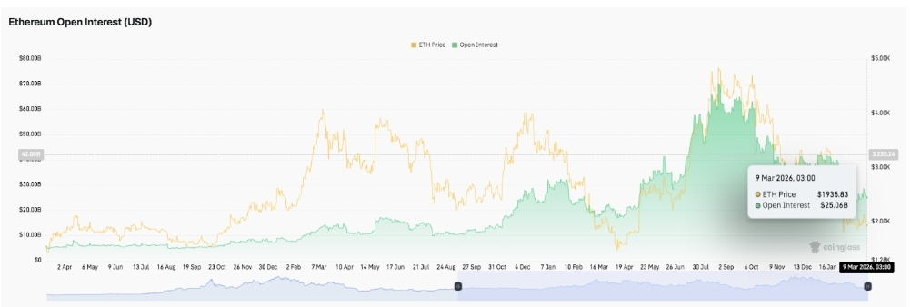 Dari sudut pandang teknis, Ethereum tampaknya menyusut dalam struktur pemulihan setelah penurunan yang panjang. Indikator momentum telah mendingin dari puncak-puncak terbaru, yang menunjukkan bahwa pasar mungkin bergerak menuju penembusan terarah berikutnya. Selain itu, data derivatif menunjukkan ekspansi dan penyusutan siklis dari leverage, yang sering kali mengarah pada volatilitas tajam setelah harga keluar dari konsolidasi.