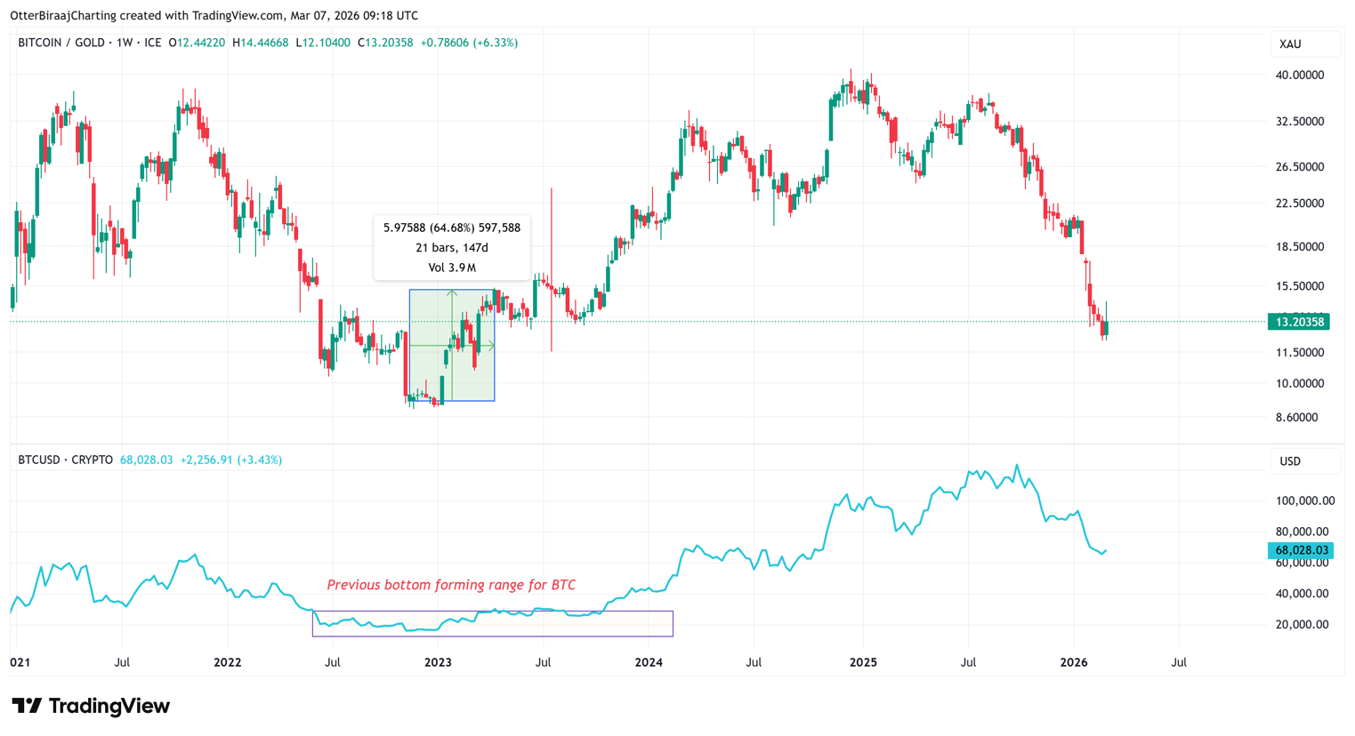 La relación BTC-oro actualmente se negocia cerca de la misma zona de consolidación observada durante las fases de rotación anteriores en 2022-2023.