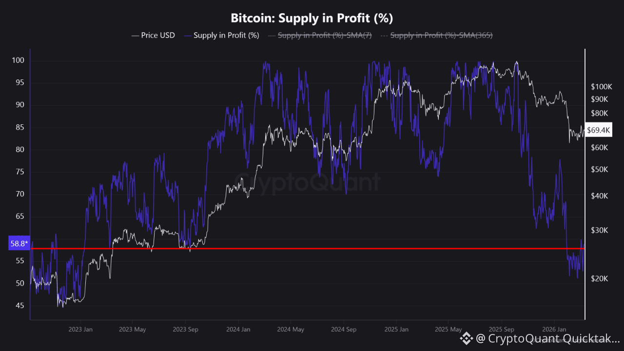 The "froth" has been wiped out. And while the price drop hurts, the Supply in Profit metric hitting sub-60% is actually a healthy reset for the macro trend. It flushes out leveraged traders and "weak hands," transferring coins to those with a lower cost basis and higher conviction.