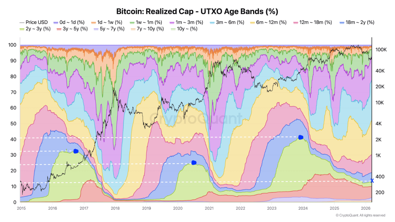 Lantai yang berkelanjutan secara historis memerlukan Pemegang Jangka Panjang (>2 tahun) untuk melebihi 20% dari Kap Realisasi. Saat ini, mereka hampir berada di 15%. Dukungan struktural dari modal jangka panjang tetap tipis, menunjukkan lantai pasar yang rapuh hingga dominasi LTH pulih.