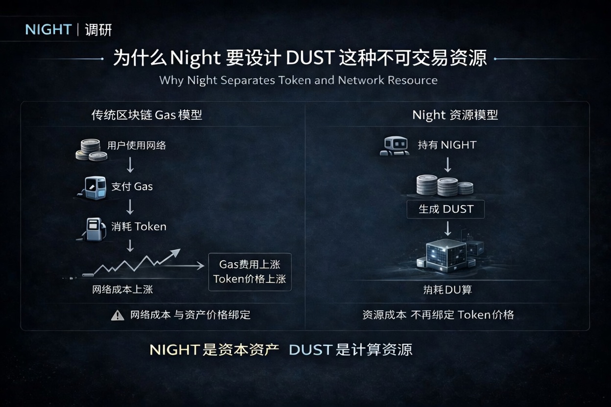 也就是说真正用于交易和计算的并不是NIGHT而是 DUST,更有意思的是DUST本身并不是一个可以自由交易的代币,这其实带来一个挺有意思的问题,为什么@MidnightNetwork 不直接用NIGHT当Gas?