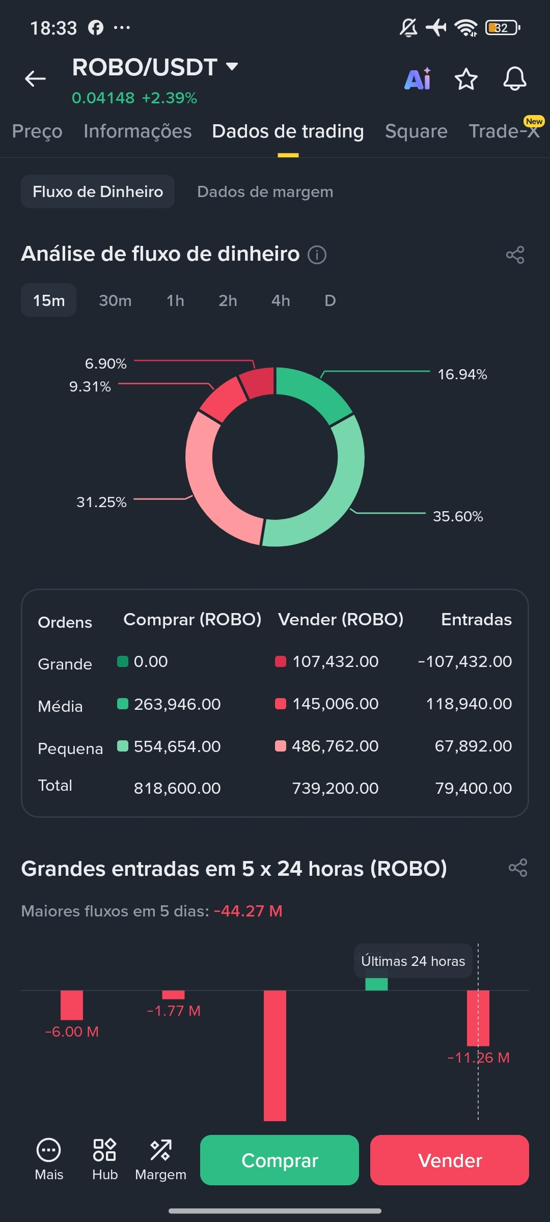 Olha esse dado aqui do gráfico de fluxo de caixa do $ROBO agora há pouco — janela de 15 minutos, entrada líquida de +79.400 tokens. Ordens médias comprando 263 mil contra 145 mil de vendas. Ordens pequenas comprando 554 mil contra 486 mil. O único segmento vendendo líquido são as grandes ordens, com -107 mil. Isso me chama atenção porque geralmente quando baleia vende e varejo compra, pode ser distribuição — mas também pode ser que o varejo tá acumulando enquanto o smart money ajusta posição. Não é conclusivo, mas é o tipo de dado que eu olho antes de tomar qualquer decisão.