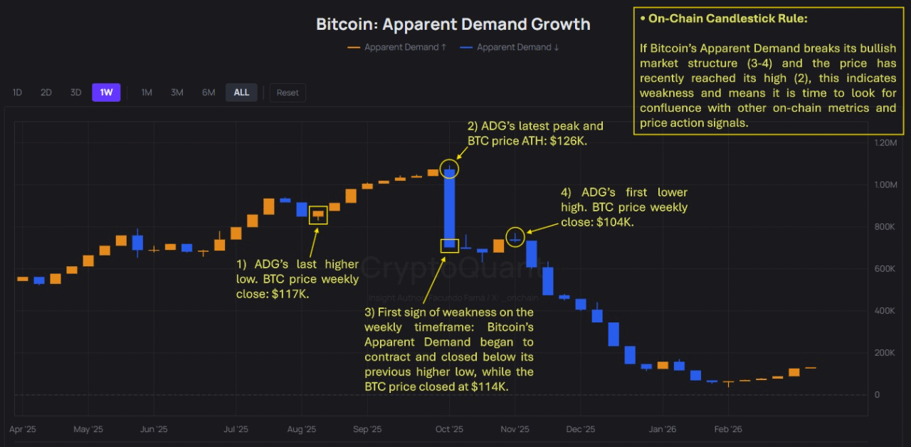 • Jika Permintaan Bitcoin yang Jelas melanggar struktur pasar bullishnya (3-4) dan harga baru-baru ini mencapai tinggi (2), ini menunjukkan kelemahan dan berarti sudah saatnya untuk mencari konfluensi dengan metrik on-chain lainnya dan sinyal aksi harga.