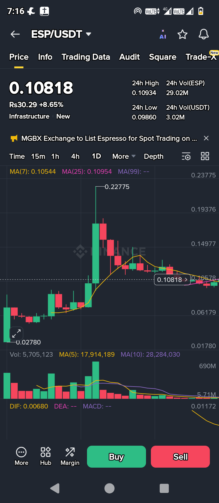 ESP has recently shown strong volatility after a massive pump from the $0.027 area to $0.22, creating significant attention in the market. After this sharp rally, the price is now going through a healthy consolidation phase around the $0.10โ$0.11 zone.
