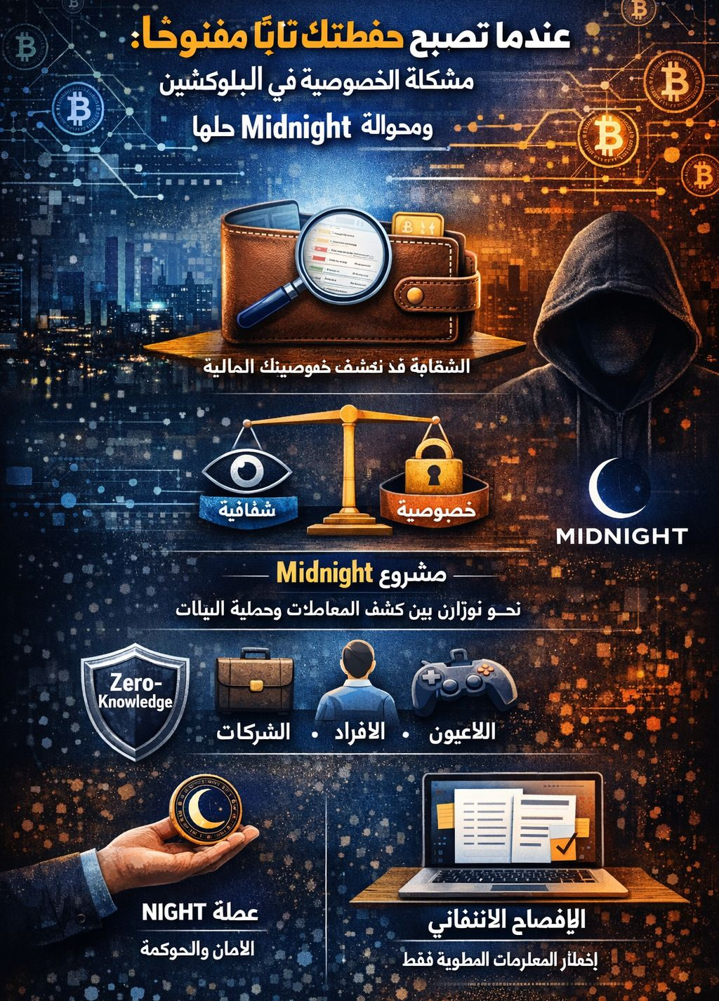 من هذا النوع من الأسئلة ظهرت أفكار مشاريع تحاول معالجة المشكلة بدلاً من تجاهلها، ومن بينها مشروع Midnight. الفكرة الأساسية ليست إخفاء كل شيء، بل إيجاد نموذج يسمح بوجود الشفافية عند الحاجة، والخصوصية عندما تكون مطلوبة.