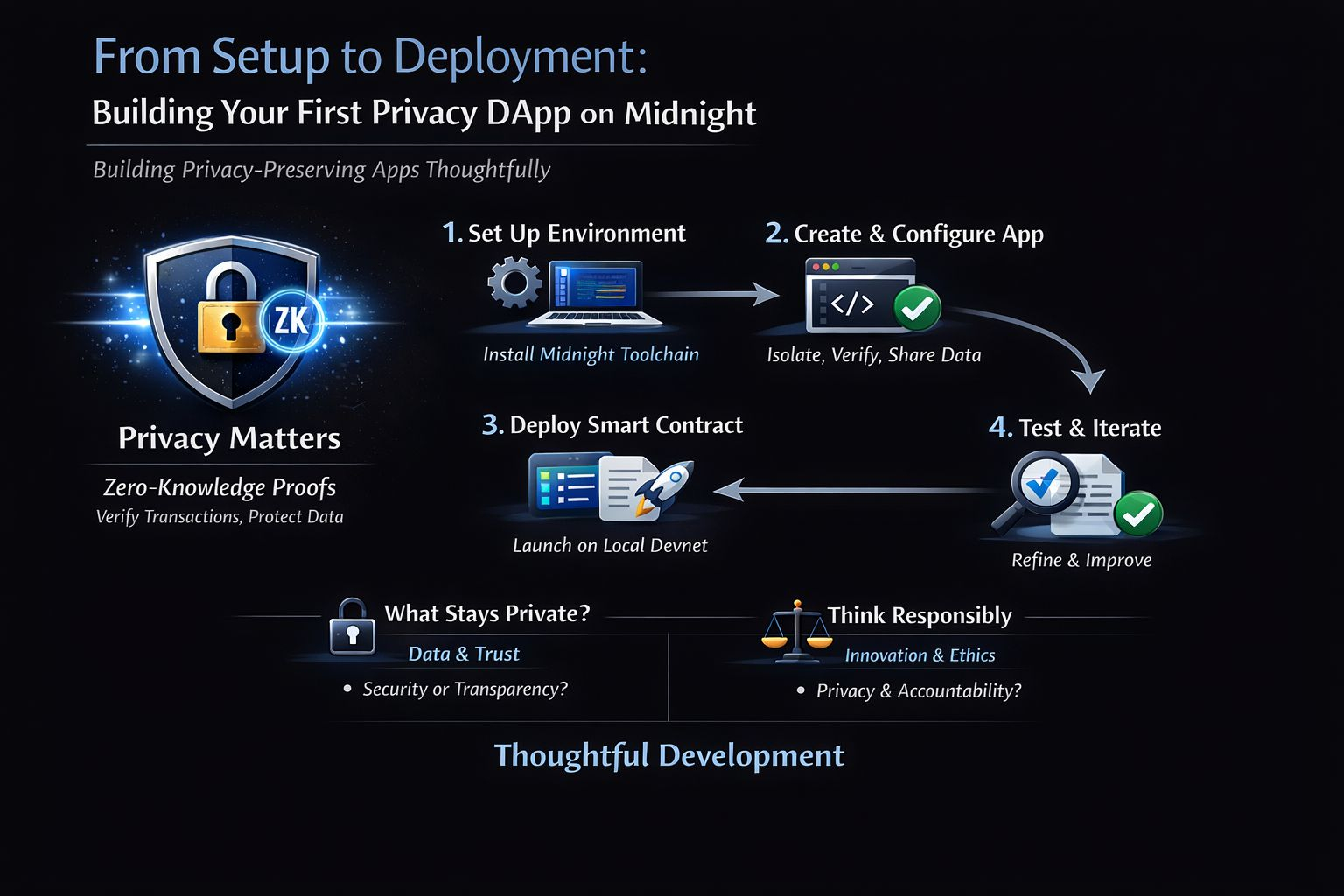 It’s easier to start your journey of building a Midnight application than you think. Start by setting up your local environment and installing the Midnight toolchain. After setting up your environment create and configure your first Midnight application thinking about how the data would be isolated verified and shared. Once your application structure is ready, deploy your smart contract and service to your local devnet.