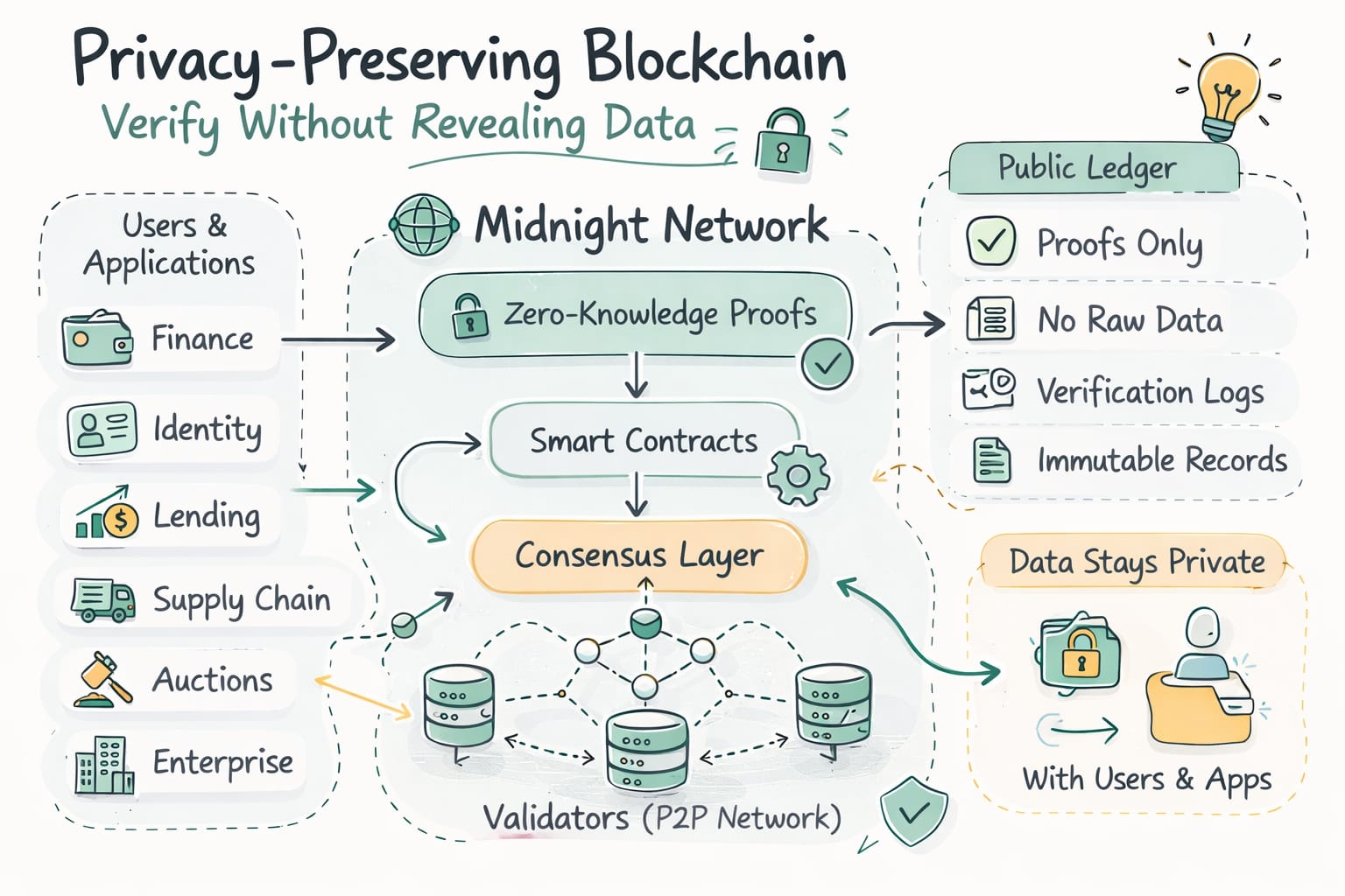 Zero-Knowledge Verification: Nodes prove computations are correct without revealing secrets.